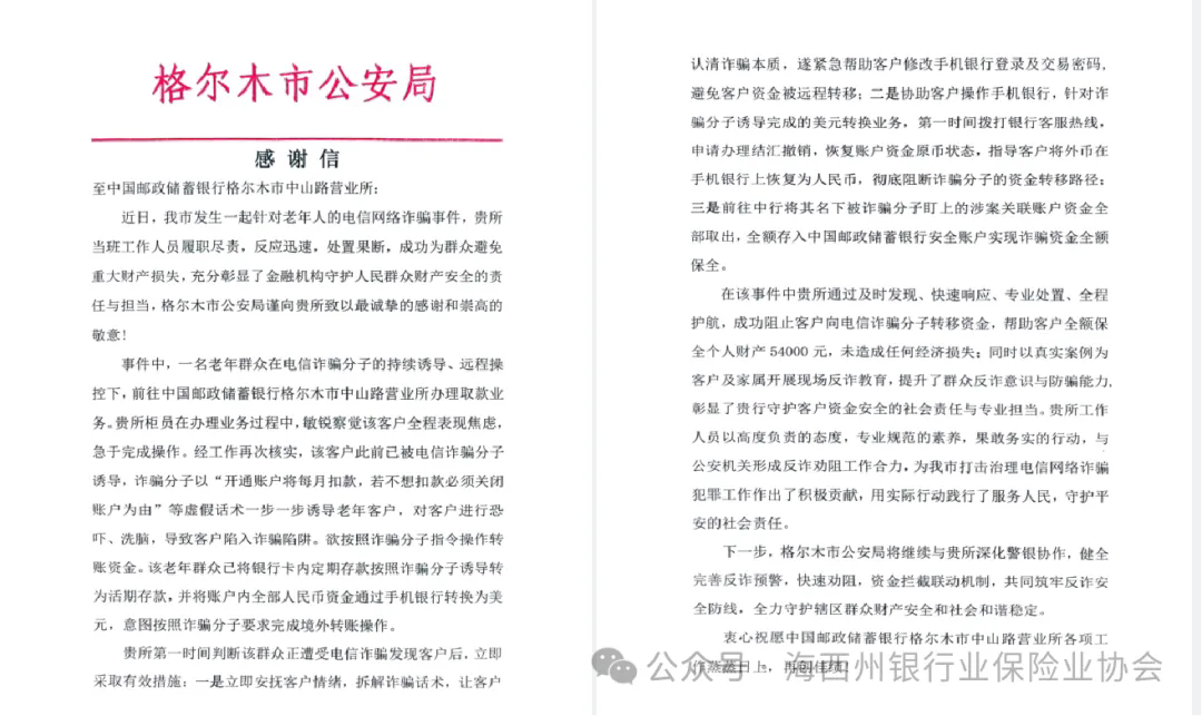 近日,邮政集团格尔木市分公司凭借敏锐的风险识别能力、专业的应急处置水平和高效的警银联动配合,成功拦截一起电信网络诈骗案件,为客户保全54000元个人资金,切实守护了客户的财产安全,赢得了当地公安机关和客户的高度认可。